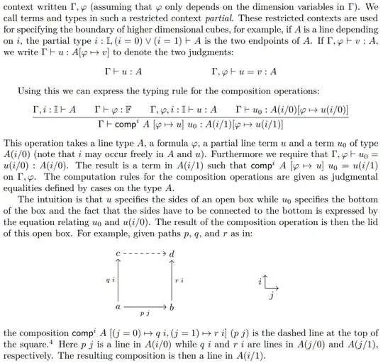 As far as I understand, the $\mathsf{comp}^i$ operator lets you transport an $n$-dimensional cube along $i$ and if you already know how some of the faces in the resulting $n+1$-dimensional cube should look like, you can specify them. So for example, $\mathsf{comp}^i A\ [(j=0)\mapsto q\ i]\ (p\ j)$ would only respect $q\ i$ but at $j=1$, the resulting face would not necessarily equal $r\ i$, is that correct?