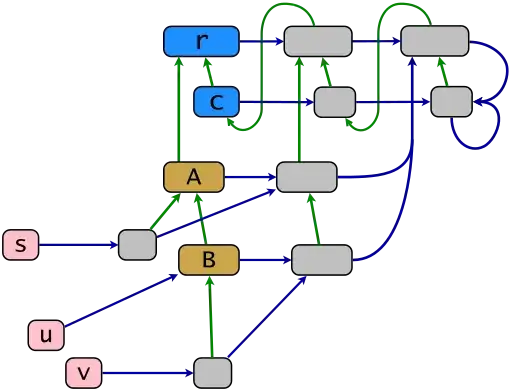 A sample core structure according to the Ruby object model is shown by the following diagram. Green links show the inheritance relation in the reflexive transitive reduction, blue links show the membership relation in the "subsumption reduction" – a blue link from x points to the least container of x. The powerclass map .ec is formed by horizontal blue links. Objects from the image of this map are powerclasses (in gray). In Ruby they are called eigenclasses or also singleton classes (the latter term being rather deprecated). Objects s, u and v (in pink) are terminal, the remaining objects are descendants of the inheritance root r.
