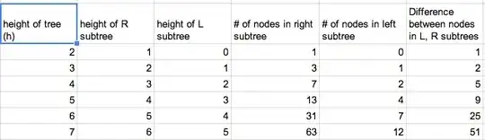 But I simply cannot figure out a pattern for the maximum possible difference between the number of nodes in the two subtrees. My current guess is that the max possible difference between the two number of nodes is 2h-1 - (h-2).