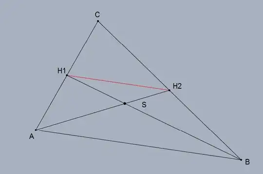 The line H$1$H$2$ is parallel to the line AB. ASB and H$1$SH$2$ are similar triangles because their angles are equal. Since AB=2$\times$H$1$H$2$, similarity implies that AS=2$\times$SH$2$ and that BS=2$\times$SH$1$ as claimed.