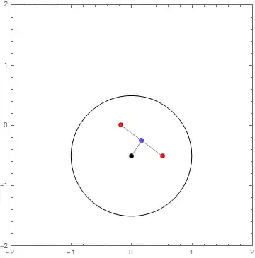 Just to clarify (to reiterate comment below in answer to question by @Anaedonist), given a step size of 1 unit (the unit circle around the black point), the black point will move 1 unit in the direction of the midpoint (dark blue) of its corresponding pair (red), so its new position is the light blue point (image on left), unless the midpoint is inside the unit circle, in which case, the step size is smaller, and the light blue point reaches the midpoint (image on right):