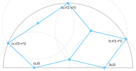 The black dots are the key points in the problem; we will derive expressions for their coordinates later. Each red line segment is a radius of some small disc, so all of them have the same length, which I will call $r$. The red dot is the centre of the disc in the top-left corner of the diagram, and the two segments incident to it form a diameter.