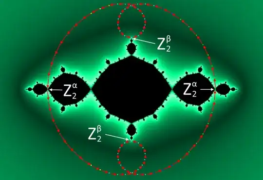 When this function is traced out, it creates the exact same shape as the fixed points themselves, only translated left, swapping between the first "pinch" point to the right of the main basin ($Z_1^\alpha$) and the far left limit point on the real axis ($Z_1^\beta$, far left).