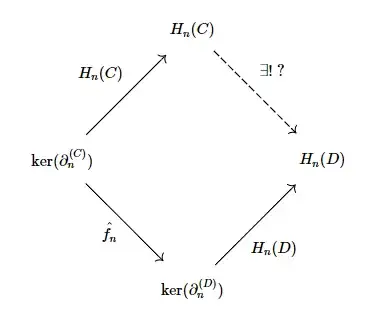 What I need to show is that there is a unique morphism $H_n(C)\to H_n(D)$ making the previous diagram commutative. How to do so ? From the linked question above, the answer suggests using universal properties from (co)kernels : how to ?