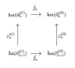 $$\begin{cases}\text{Im}(\partial_{n+1}^{(D)})\tilde{f_n}=f_n\text{Im}(\partial_{n+1}^{(C)})\\\ker(\partial_n^{(D)})\hat{f_n}=f_n\ker(\partial_n^{(C)})\\\ker(\partial_n^{(D)})\bar{c}_n^{(D)}=\text{Im}(\partial_{n+1}^{(D)})\end{cases}.$$