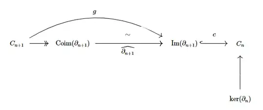 Now $g$ is epic, because $\widehat{\partial_{n+1}}$ is an iso and because $\text{Coim}(\partial_{n+1})$ is epic, as a cokernel. At last, $0=\partial_n\partial_{n+1}=\partial_ncg$, and since $g$ is epic, we get $\partial_nc=0$. Therefore, from the universal property for $\ker(\partial_n)$, we get :