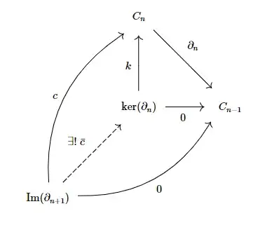 Now $\bar{c}$ is monic, for if $x:\ker(\partial_n)\to\bullet$ is such that $\bar{c}x=0$, then $k\bar{c}x=cx=0$, i.e. $x=0$ since $c$ is monic (it is an image, which in turn, is a kernel). This allows us to define : $$H_n(C)=\text{coker}(\bar{c}):\ker(\partial_n)\to H_n(C).$$
