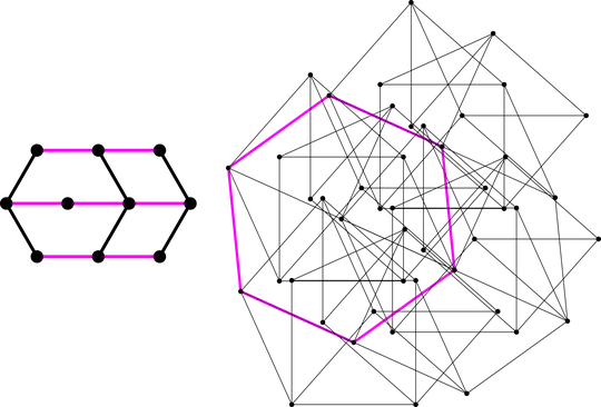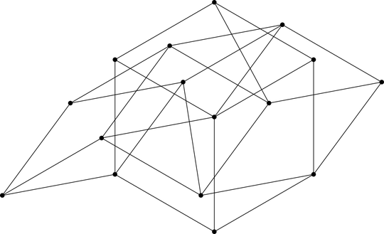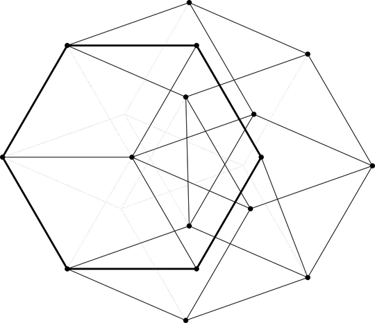 However, the above hexagon bracing is quite big. Another approach to triangle-free bracing is the virtual edge: in any embedding of the cubical graph with one edge removed, the distance between the two degree-$2$ vertices (incident to the missing edge) must always be $1$. This leads to the following triangle-free rigid regular hexagon in $16$ vertices and $29$ edges (Shibuya commit proof):