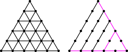 Then any triangular grid can be mimicked without triangles as follows (all straight fuchsia edges are made with the graph chaining construction above, all black edges are single sticks):