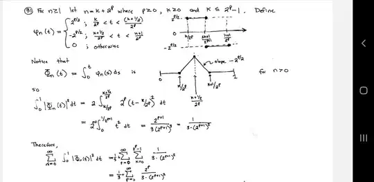So i want to prove that if: $$ \Phi_{n}(t)=\int_{0}^{t}\varphi_{n}(s)ds. $$ then $$ \sum _{n=1}^{\infty}\int_{0}^{1}\left|\Phi_{n}(t)\right|^{2} = \int_{0}^{t}(1-t)dt$$ But i don´t understand why: $$\int_{0}^{1}|\Phi_{n}(t)|^{2} = 2\int_{\frac{k}{2^{p}}}^{\frac{k+\frac{1}{2}}{2^{p}}}2^{p}\left (t-\frac{k}{2^{p}}\right)^{2}$$