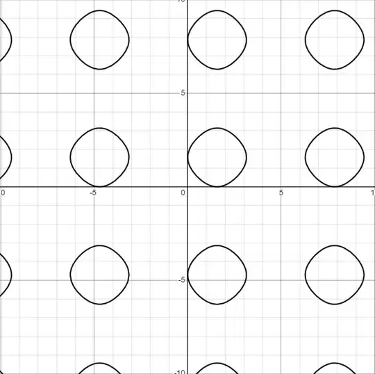 - This area is exactly the same as the area enclosed by each infinitely repeating pattern in the graph $\cos (x) + \cos (y) = 1$