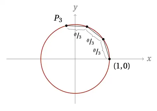 Now, if you divide the length $\theta$ by a given constant $n$ and create a sequence of multiple tail-to-tip chords, then you have $n$ points on the unit circle from $P_1$ to $P_n$ and the total length [of all chords] remains $\theta$.