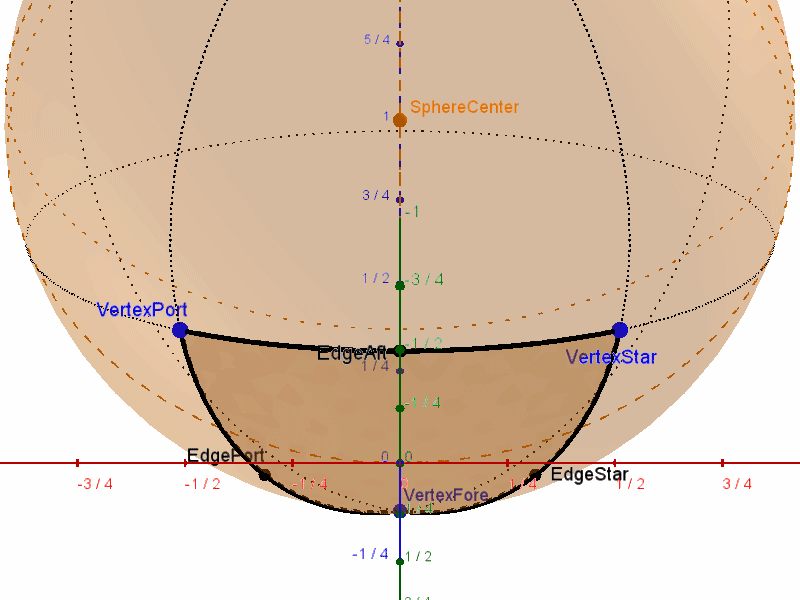 The bounding-curve $arcAft$ is a portion of a larger circle which lies on the surface of the sphere. I calculated its center-point to be $P = \left(0, −\frac{2 \sqrt{3} − 6 \sqrt{6}}{51}, 1 + \frac{9 \sqrt{3} − 10 \sqrt{6}}{51}\right)$. The arc-endpoints $VertexStar$ and $VertexPort$ span an angle of $α = \arccos\left(\frac{\sqrt{8} − 1}{4}\right)$. I can rotate $VertexPort$ about $P$ by an angle $u × α$ with $0 ≤ u ≤ 1$ to get the point