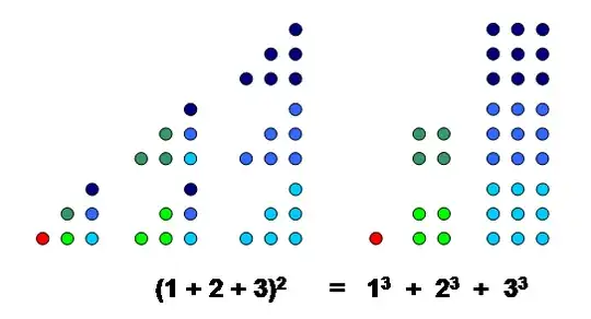 Is there an intuitive way to get cubic sum? From this post: combination of quadratic and cubic series and Wikipedia: Faulhaber formula, I get $$1^3 + 2^3 + \dots + n^3 = \frac{n^2(n+1)^2}{4}$$ I think the cubic sum is squaring the arithmetic sum $$1^3 + 2^3 + \dots + n^3 = (1 + 2 + \dots + n)^2$$ But how to prove it? Please help me. Grazie!