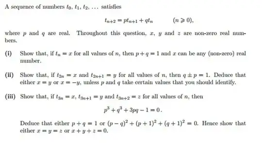 $z=\frac{(q^2+p)y}{(1-pq)^2}=\frac{((q^2+p)^2)x}{(1-pq)^2}= \frac{((q^2+p)^3)z}{(1-pq)^3}$ $\implies$ $\frac{((q^2+p)^3)}{(1-pq)^3}=1$ [as the $z$'s cancel out]. So taking the cube root leaves $\frac{q^2+p}{1-pq}=1$ or $\frac{q^2+p}{1-pq}=-1$ Multiplying these two equations produces $q^4+2pq^2 +p^2 = 2pq -(pq)^2 -1$