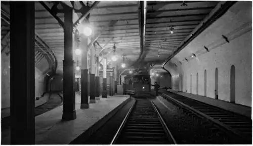 An unusual northbound-only station, Adams Square station was opened with the rest of the northern section of the Tremont Street subway on September 3, 1898. Initially designed for streetcars only, the station was retrofitted in 1901 to also handle Main Line Elevated trains, which ran through the subway until the completion of the Washington Street tunnel in 1908. Thereafter the station reverted to exclusive streetcar use.[1][2]