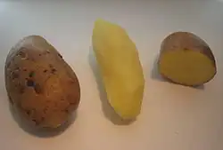 The almond potato (Norwegian: Mandelpotet,[1] Swedish: Mandelpotatis,[2] Finnish: puikulaperuna[3]), also called Mandel potato or Swedish peanut fingerling,[4][5][6] is a potato known since the 19th century.[7][8] Almond potatoes are yellow or white; in rare cases a variety called blue almond (Blå mandel in Swedish) can be found which has yellow-white flesh with blue skin. Its shape is oval and somewhat resembles an almond, hence the name. Blue almond is an old variety which was grown in the northern regions of Sweden before the yellow-peeled almond potato was introduced.[9]