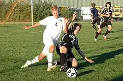 At a professional level, most matches produce only a few goals. For example, the 2022–23 season of the English Premier League produced an average of 2.85 goals per match.[111] The Laws of the Game do not specify any player positions other than goalkeeper,[112] but a number of specialised roles have evolved.[113] Broadly, these include three main categories: strikers, or forwards, whose main task is to score goals; defenders, who specialise in preventing their opponents from scoring; and midfielders, who dispossess the opposition and keep possession of the ball to pass it to the forwards on their team. Players in these positions are referred to as outfield players, to distinguish them from the goalkeeper.[114]