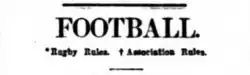 These ongoing efforts contributed to the formation of the Football Association (the FA) in 1863, which first met on the morning of 26 October 1863 at the Freemasons' Tavern in Great Queen Street, London.[43] The only school to be represented on this occasion was Charterhouse. The Freemasons' Tavern was the setting for five more meetings of the FA between October and December 1863; the English FA eventually issued the first comprehensive set of rules named Laws of the Game, forming modern football.[9] The laws included bans on running with the ball in hand and hacking (kicking an opponent in the shins), tripping and holding.[44] Eleven clubs, under the charge of FA secretary Ebenezer Cobb Morley, ratified the original thirteen laws of the game.[43] The sticking point was hacking, which a twelfth club at the meeting, Blackheath FC, had wanted to keep, resulting in their withdrawal from the FA.[43] Other English rugby clubs followed this lead and did not join the FA, and instead in 1871, along with Blackheath, formed the Rugby Football Union. The 1863 FA rules included handling of the ball by "marks" and the lack of a crossbar, making the game remarkably similar to Victorian rules football, which was being developed around the same time in Australia. The Sheffield FA played by its own rules until the 1870s, with the FA absorbing some of its rules until there was little difference between the games.[45]