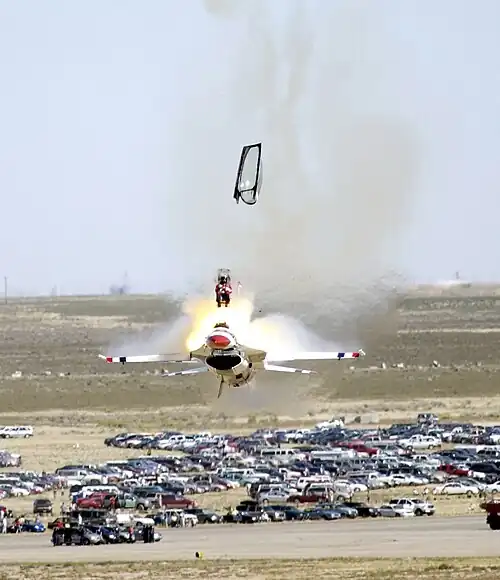 A USAF Thunderbird pilot ejecting from his F-16 aircraft at an air show in 2003.