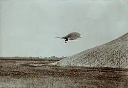 Otto Lilienthal was the first person to make well-documented, repeated, successful flights with gliders,[16] therefore making the idea of "heavier than air" a reality. Newspapers and magazines published photographs of Lilienthal gliding, favorably influencing public and scientific opinion about the possibility of flying machines becoming practical. Lilienthal's work led him to develop the concept of the modern wing.[17][18] His flight attempts in Berlin in 1891 are seen as the beginning of human flight[19] and the Lilienthal Normalsegelapparat is considered to be the first airplane in series production, making the Maschinenfabrik Otto Lilienthal in Berlin the first air plane production company in the world.[20] Lilienthal is often referred to as either the "father of aviation"[21][22][23] or "father of flight".[24]