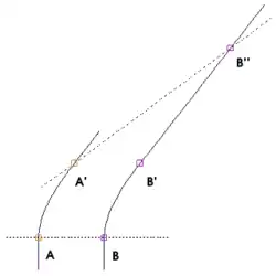 Another method was shown by Dewan (1963) who demonstrated the importance of relativity of simultaneity.[8] The perspective of frame S′ is described, in which both ships will be at rest after the acceleration is finished. The ships are accelerating simultaneously at in S (assuming acceleration in infinitesimal small time), though B is accelerating and stopping in S′ before A due to relativity of simultaneity, with the time difference: