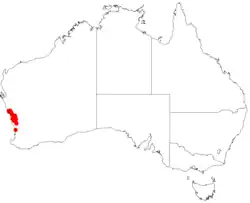 This species of blue tinsel lily is relatively common between Gillingarra (near New Norcia) and Eneabba and common in Watheroo and Alexander Morrison national parks. It usually grows in shallow white or grey sand over laterite on kwongan slopes.[1]