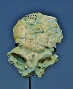 Catopithecus is an early catarrhine fossil. It is known from more than 16 specimens of a single species, Catopithecus browni, found in the Jebel Qatrani Formation of the Faiyum Governorate, Egypt.[1] The Jebel Qatrani Formation has been divided into two main faunal zones based on the fact that the fauna found in the lower portion of the quarry appear to be more primitive than those found in the upper section.[2] The upper zone has been dated to older than 31 ± 1 myr based on the dating of a basalt layer that lies immediately above the formation and Nicolas Steno's Law of Superposition.[1] The lower zone contains the late Eocene green shale unit called Locality-41 (L-41) in which all the specimens of Catopithecus browni have been found. The relative dating of L-41 based on paleomagnetic correlations places it at 36 Myr according to Simons et al (1999),[3] but Seiffert (2006) suggests this should be revised to 34.8-33.9 Myr.[4]
