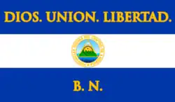 The historic military flag of the United Provinces of Central America with the national motto (God. Union. Liberty.) and the National Battalion initials (B.N.) in golden amber color