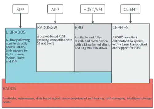 The "librados" software libraries provide access in C, C++, Java, PHP, and Python. The RADOS Gateway also exposes the object store as a RESTful interface which can present as both native Amazon S3 and OpenStack Swift APIs.