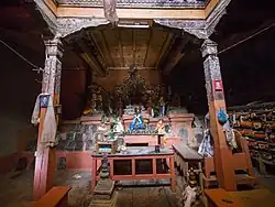 Lama Chhiwang Thilen, Chhairo gompa's founder, is believed to have painted the original frescoes in sMon and Gya Bris styles.[15] They are predominantly in the sMon Bris style with elements of U Birs and even Bal Bris. The original frescoes in the lhakang were washed off and redone by Kamal Dhoj Tulachan, Shashi Dhoj Tulachan's father in 1960. (c) 1981 the central altar statue was a Sakyamuni[16] (c) 1994 the central figure at the gompa altar was a clay image of Sakyamuni, flanked by his disciples, Ananda and Sariputra. Numerous small statues of Chhairo Gompa's past lamas and benefactors are also found. A lifelike clay image of the founder, Chhiwang Thilen, sat on the right corner of the altar. The interior of the roof lantern was panelled with slate carvings.