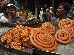 Chawk Bazar has a great significance in Bengali culture during Ramadan. While its popularity as a business hub has diminished over the years, Chawk Bazaar is the busiest iftar market. One of the most iconic, and often derided, items is the "boro baper polay khay."[3] Other iconic dishes includes Shahi jilapi, popularly known as "Sunflower Jalebis",[4] Beguni, Piyaju, Keema Paratha, Beauty lassi, Koel roast, Dim chop, Alur chop, Puran Dhaka Haleem, Hajir Biryani, Chickpeas, fruits, Pithas and Mishtis (Bengali sweets) like Sandesh, Roshogolla, Chomchom, Rasmalai, Bakarkhani, Pantua, Chennar Jilapi, etc. In 2023 UNESCO added iftar to its list of Intangible Cultural Heritage.[5]