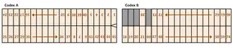 Today's page numbers were assigned by Aglio when he became the first to transcribe the manuscript in 1825–26. For this, he divided the original codex into two parts, labeled Codex A and Codex B. He sequenced Codex A on the front side followed by its back side, with the same order on Codex B.