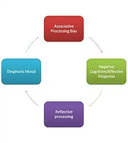 The feedback loop in the dual process model is between self referent cognition and dysphoria. The feedback loop establishes an inability to apply reflective processing to correct negative biases.[6]