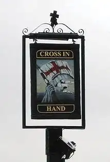 The English Place-Name Society gives the earliest reference to the village as Cruce Manus, the Latin for Cross-in-Hand, recorded in 1547, which by 1597 was being rendered Crosse atte Hand and by 1656 was being called Crosse in the Hande.[2] The name is believed to be based on a legend that Crusaders assembled here before sailing for the Holy Land from Rye to fight Saladin. An alternative explanation is that it is the place where some murderers managed to escape their pursuers by turning to face them with a cross in their hands.[3]