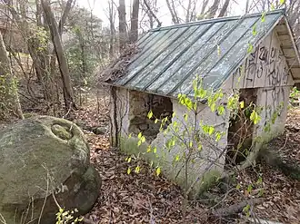 A stone springhouse with stucco is the sole remaining historical building, left in an unpreserved state.[1]