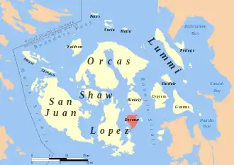 Decatur Island is one of the San Juan Islands in Washington state, USA. Located just east of Lopez Island across Lopez Sound and just south of Blakely Island across Thatcher Pass, it is 3.524 square miles (9.127 km²) in area, and was named by the Wilkes Expedition in 1841 for naval officer Stephen Decatur.[1]