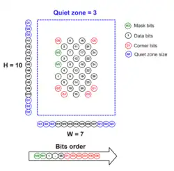- Corner points, marked as red on diagram, which can be used as data bits or padding bits (black dots);