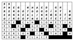 The upper half of the puzzle consists of columns with letters. These letters should fall from the letter column perpendicular to the bottom of the diagram. The given column letters are sometimes given in alphabetical order. The words of the quote are separated by black boxes. A word that is broken at the end of a line continues on the next line. Diagram boxes containing punctuation or numbers are not filled with letters. When the quote puzzle is filled in, there are no letters left.