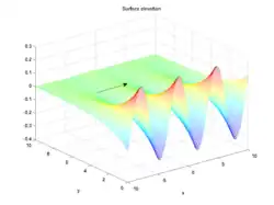 In fluid dynamics, an edge wave is a surface gravity wave fixed by refraction against a rigid boundary, often a shoaling beach. Progressive edge waves travel along this boundary, varying sinusoidally along it and diminishing exponentially in the offshore direction.[1]