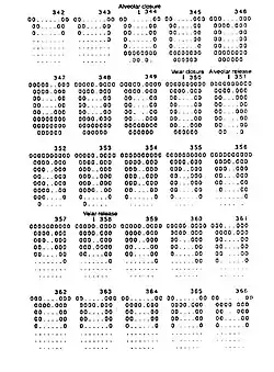 When electropalatography is used for speech research, the data from tongue-palate contact is sampled by the controlling computer at up to 100 frames per second. In the early days (when digital displays were less ubiquitous and more limited), the data was printed out on paper for analysis. An example of the printout can be seen in Fig.2, where the sequence runs from top to bottom, and where the 'O' symbol indicates contact and '.' indicates no contact. The utterance shown is 'catkin' /kæt.kɪn/; the sample numbered 344 shows when the /t/ closure is complete, and at frame 350 there is a complete velar closure. The alveolar closure is released at 351. The articulatory overlap (which is inaudible) is thus clearly shown.[5] Individual frames of EPG contact data may be used to illustrate descriptions of consonant articulations, and this is done by Cruttenden for all the English (RP) consonants.[6] In some research, multiple repetitions may be summed to produce graphical representations of tongue-palate contact in a way that minimizes effects of random variation on single tokens. This was done by Farnetani in studies of Italian and French coarticulation.[7]