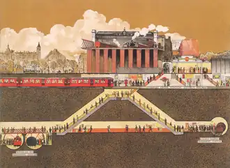 Numerous proposals for underground connections for the mainline station were considered in the decades after its opening. Almost as soon as work was complete on the station, the SER wanted to build a connection from Charing Cross to the railway terminals further north. Soon after Charing Cross station opened, the North Western and Charing Cross Railway Act was passed, a joint act between the SER and the London and North Western Railway (LNWR) that proposed a shallow sub-surface line to Euston.[23] The scheme collapsed in 1866 due to a shortage of funding caused by a banking crisis. The scheme was revived with the London Central Railway, that proposed to link Charing Cross to Euston and St Pancras, but was again abandoned in 1874.