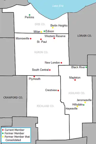 The Firelands Conference is an Ohio High School Athletic Association (OHSAA) athletic league located in north-central Ohio. The league was formed in the 1960–61 school year and is named for the Firelands area of the old Western Reserve, where most of the member schools reside.[1] High schools in this conference are located in Ashland, Huron, and Richland counties. Some of the schools' district boundaries extend into the neighboring counties of Crawford, Erie, and Lorain. Most of the founding schools came from the defunct Huron-Erie League.