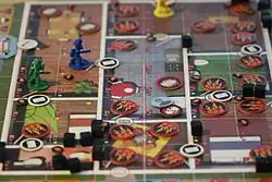 Flash Point: Fire Rescue is a thematic cooperative board game designed by Kevin Lanzing with the help of firefighters[1] that was released in November 2011.[2] The objective is for players to work together to rescue people and animals from a burning building before it collapses. Since the initial release of the game several expansions have been published, which add additional scenarios for players experience. These include fires in a high rise building, a two-story house, and a submarine.