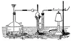Annoyed by that, Marsh developed a much better test. He combined a sample containing arsenic with sulfuric acid and arsenic-free zinc, resulting in arsine gas. The gas was ignited, and it decomposed to pure metallic arsenic, which, when passed to a cold surface, would appear as a silvery-black deposit.[40] So sensitive was the test, known formally as the Marsh test, that it could detect as little as one-fiftieth of a milligram of arsenic. He first described this test in The Edinburgh Philosophical Journal in 1836.[41]