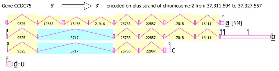 This figure depicts the transcript variants of GPATCH11 and was obtained from NCBI Aceview.[8] Transcripts a and b have known functioning proteins.