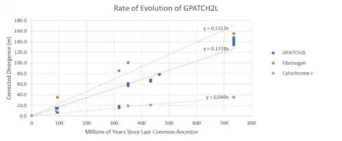 GPATCH2L evolves more slowly compared to Fibrinogen Alpha Chain but faster than Cytochrome C.[19] In the unrooted tree of GPATCH2L protein, only one mammal (human) is included since every species in mammals is very closely related to each other, showing various short lines. Arthropoda in invertebrates shows the longest line, meaning that they have diverged the longest.