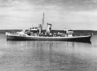Flower-class corvettes like Chicoutimi serving with the Royal Canadian Navy during the Second World War were different from earlier and more traditional sail-driven corvettes.[3][4][5] The "corvette" designation was created by the French as a class of small warships; the Royal Navy borrowed the term for a period but discontinued its use in 1877.[6] During the hurried preparations for war in the late 1930s, Winston Churchill reactivated the corvette class, needing a name for smaller ships used in an escort capacity, in this case based on a whaling ship design.[7] The generic name "flower" was used to designate the class of these ships, which – in the Royal Navy – were named after flowering plants.[8]