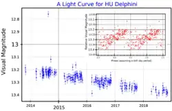 ![]() A visual band light curve for HU Delphini, plotted from ASAS-SN data.[1] The main plot shows the long-term variability, and the inset plot shows the periodic variability. | |
