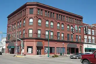 The Howes Building is a historic building located in Clinton, Iowa, United States. The four-story, brick, Neoclassical structure features arched windows, pilasters, and a chamfered corner. At one time it had a prominent entrance on the corner that was flanked by columns in the Doric order. The columns remain in place even though the entrance has been modified. The architect for the first three stories, finished in 1900, was Josiah Rice. The fourth story, finished five years later, was designed by John Morrell. Both were local architects, Morrell having purchased the Rice firm in 1903. The contractor was John Lake. Edward M. Howes had the building constructed during a period of population and economic growth in Clinton.[2] The two upper floors have housed the offices of local professionals. The first and second floors have housed various retail establishments, including Kline's Department Store, Stage Department Store, Jefferson Billiards Shop, Metzger and Cavanaugh Men's Tailors, and the Kaybee Store. The building has been listed in the National Register of Historic Places since 2004.[1]